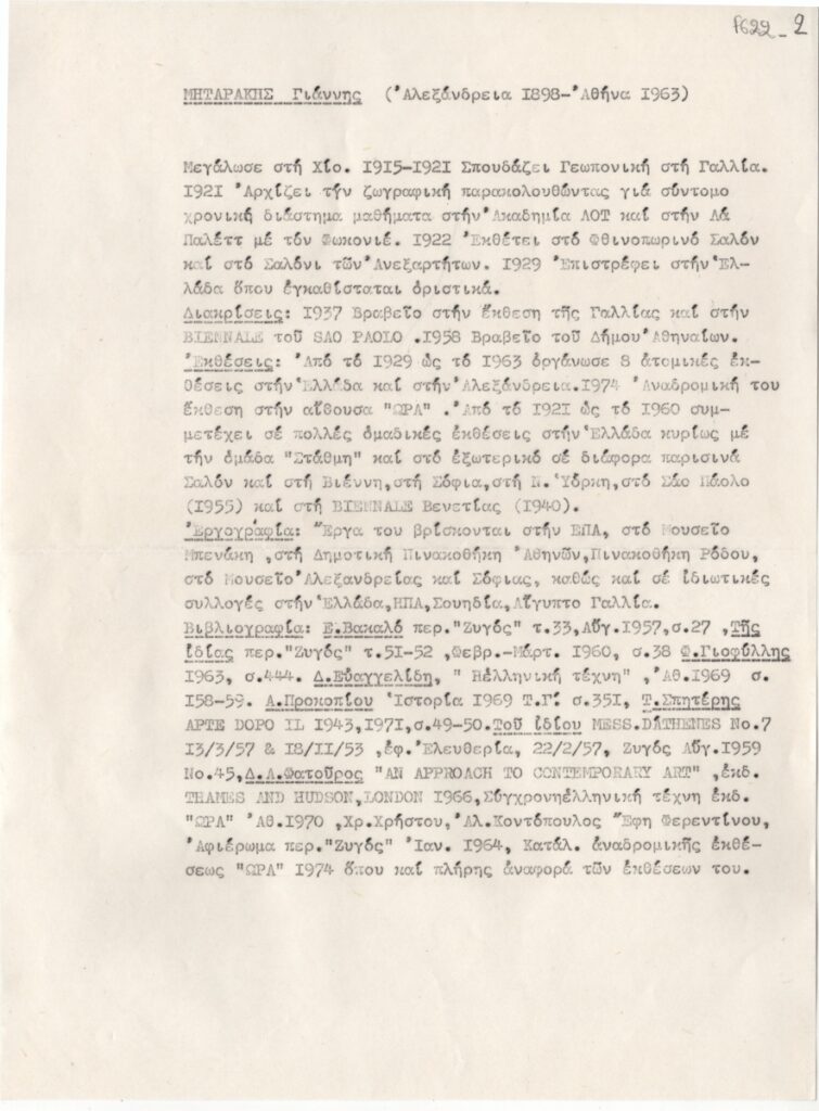 Κείμενο, δακτυλόγραφο, στα ελληνικά, χαρτί, 28,9×21,2 εκ. Βιογραφικό σημείωμα του ζωγράφου Γιάννη Μηταράκη με αναφορές στις σπουδές του, τις διακρίσεις που έλαβε, τις ατομικές και ομαδικές εκθέσεις στις οποίες συμμετείχε, εργογραφία και βιβλιογραφία για το έργο του.