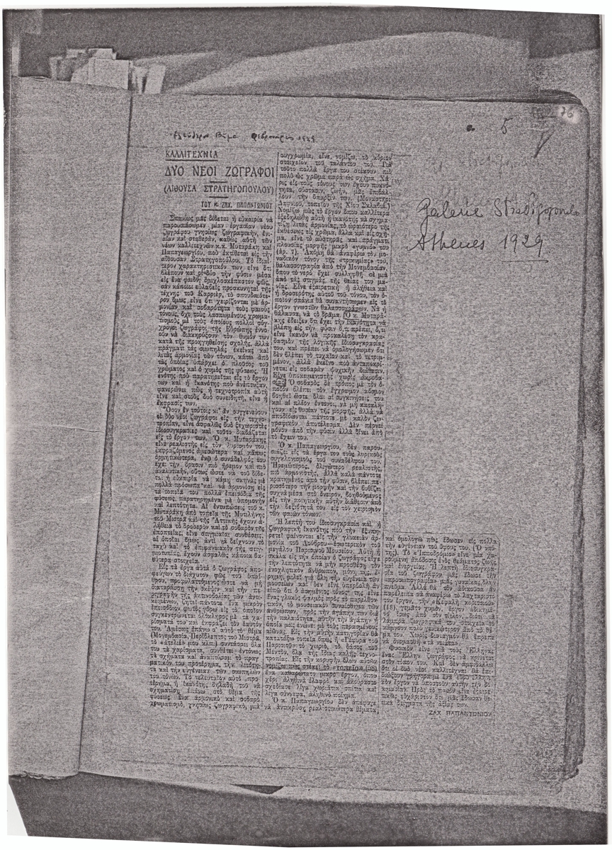 Φωτοαντίγραφο αποκόμματος εφημερίδας, στα ελληνικά, χαρτί, 29,5×21,2 εκ. Κριτική της ομαδικής έκθεσης ζωγραφικής με έργα Γιάννη Μηταράκη και Αριστείδη Παπαγεωργίου (Παπαζώρζ) στην Αθήνα το 1929. Επάνω επιγραφή με τα στοχεία της δημοσίευσης. Δεξιά επιγραφή με τα στοιχεία της έκθεσης.