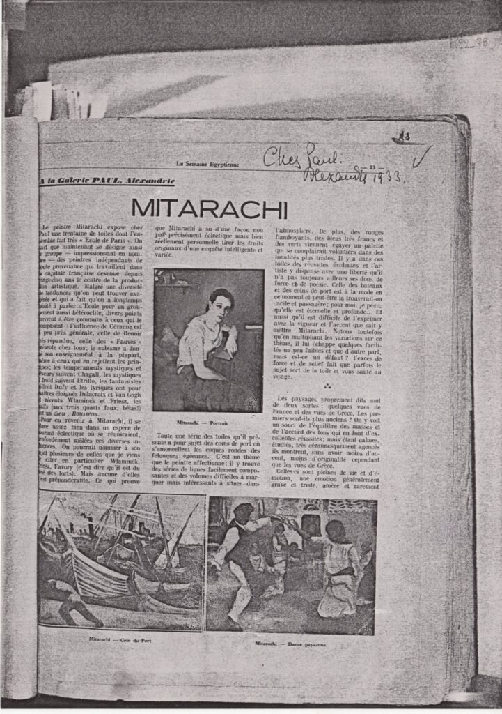 Φωτοαντίγραφο αποκόμματος περιοδικού, στα γαλλικά, χαρτί, 29,8×21,2 εκ. Κριτική για την ατομική έκθεση του Γιάννη Μηταράκη στην Αλεξάνδρεια της Αιγύπτου το 1933. Εικονογραφείται με αναπαραγωγές έργων. Επάνω, επιγραφή με τ στοιχεία της έκθεσης.
