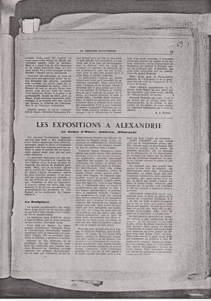 Φωτοαντίγραφο αποκόμματος περιοδικού, στα γαλλικά, χαρτί, 29,8×21,0 εκ. Κριτική της ομαδικής έκθεσης με τίτλο “Salon d’Hiver” που διοργανώθηκε στην Αλεξάνδρεια της Αιγύπτου. Αναφέρονται έργα του Γιάννη Παππά, της Gaby Cremisy, του Germain Chaloub και του Mahmoud Moussa. Στο ίδιο τεκμήριο απόσπασμα κριτικής του A. I. Patry για την συναυλία μουσικής δωματίου των Bernard Michelin (βιολοντσέλλο) και Τάσου Γιαννόπουλου (πιάνο) την ίδια περίοδο.