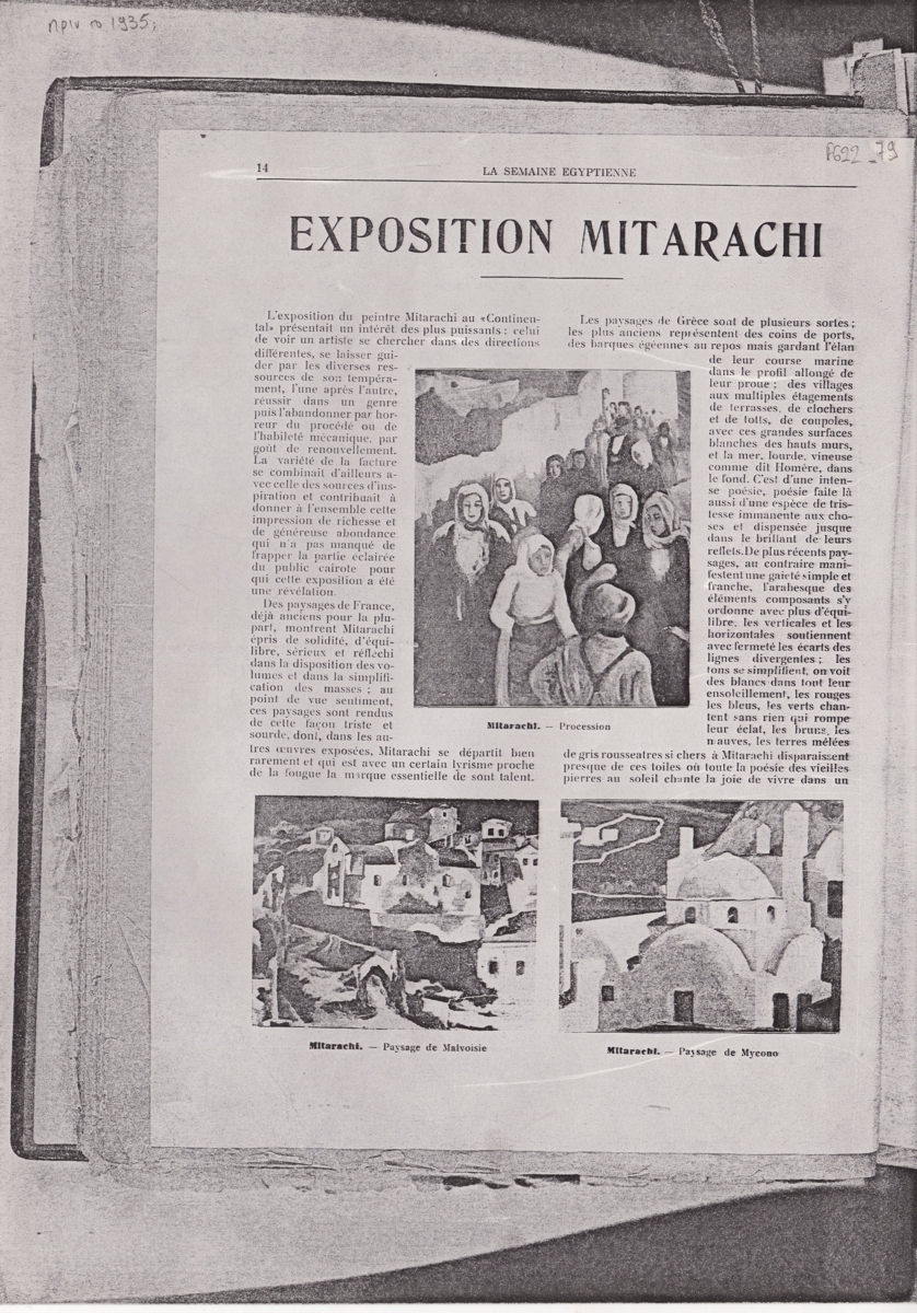 Φωτοαντίγραφο αποκόμματος περιοδικού, στα γαλλικά, χαρτί, 29,8×29,8 εκ. Κριτική του Etienne Meriel για την ατομική έκθεση ζωγραφικής του Γιάννη Μηταράκη στο Κάιρο της Αιγύπτου. Εικονογραφείται με αναπαραγωγές έργων.