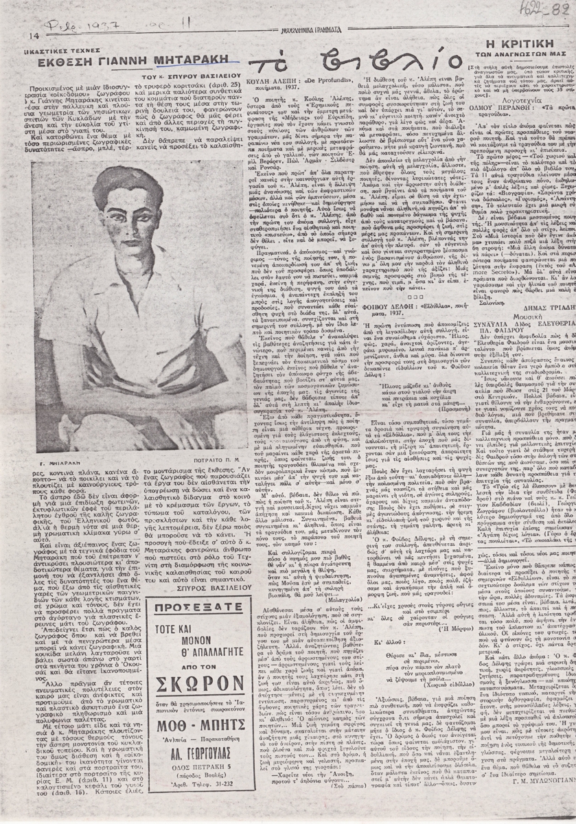 Αριστερά στη σελίδα κριτική του Σπύρου Βασιλείου για την ατομική έκθεση ζωγραφικής του Γιάννη Μηταράκη στην Αθήνα το 1937.