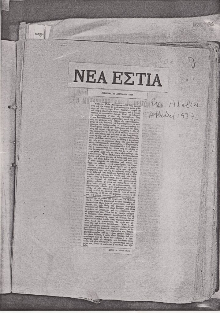 Φωτοαντίγραφο αποκόμματος περιοδικού, στα ελληνικά, χαρτί, 29,8×21,0 εκ. Κριτική του Διον. Α. Κόκκινου για την ατομική έκθεση ζωγραφικής του Γιάννη Μηταράκη στην Αθήνα το 1937. Δεξιά επιγραφή με τα στοιχεία της έκθεσης.