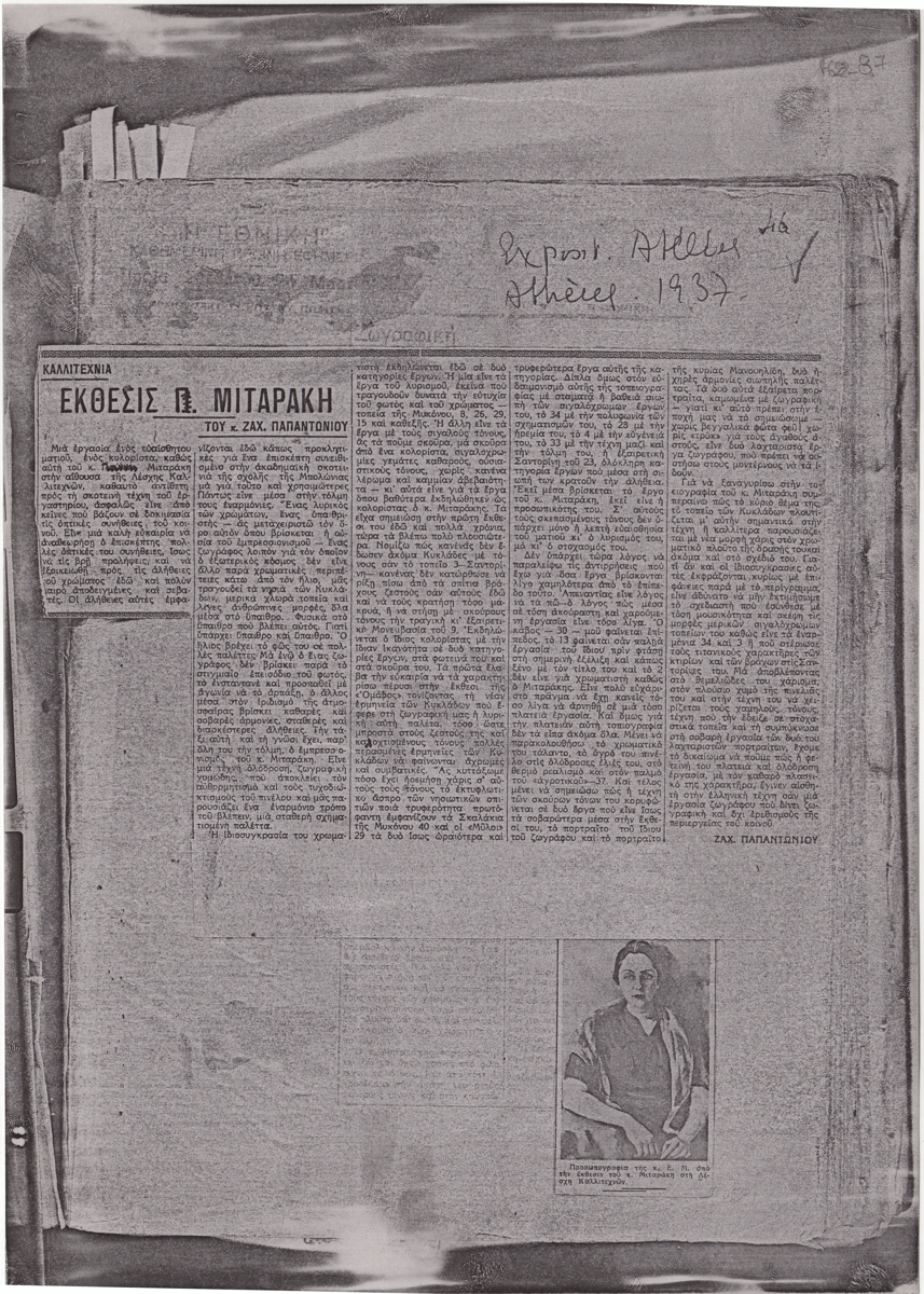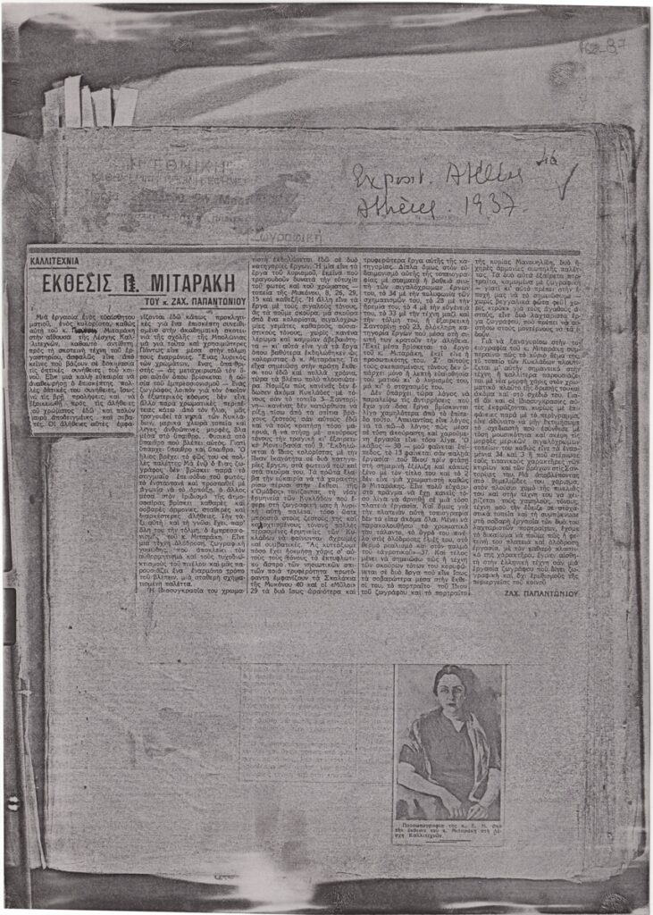 Φωτοαντίγραφο αποκόμματος εφημερίδας, στα ελληνικά, χαρτί, 29,8×21,0 εκ. Κριτική του Ζαχαρία Παπαντωνίου για την ατομική έκθεση ζωγραφικής του Γιάννη Μηταράκη στην Αθήνα το 1937. Εντάσσεται στη στήλη “Καλλιτεχνία”. Εικονογραφείται με αναπαραγωγή έργου. Επάνω επιγραφή με τα στοιχεία της έκθεσης.