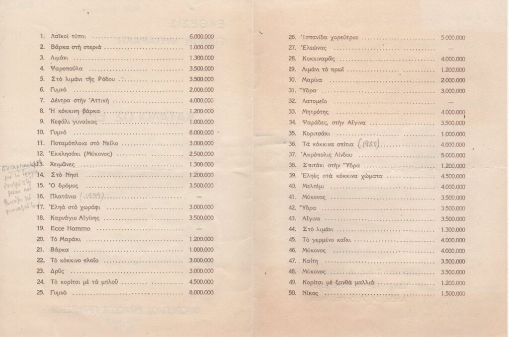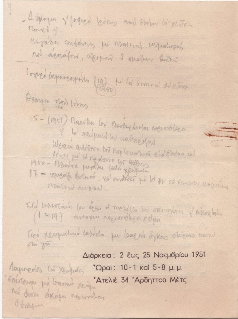 Έντυπο έκθεσης, στα ελληνικά, δίπτυχο, χαρτόνι, 19,2×14,4 εκ. Τιμοκατάλογος έργων της ατομικής έκθεσης ζωγραφικής του Γιάννη Μηταράκη στην Αθήνα το 1951. Σε όλες τις όψεις του εντύπου κριτικές και άλλες σημειώσεις του Τώνη Σπητέρη.