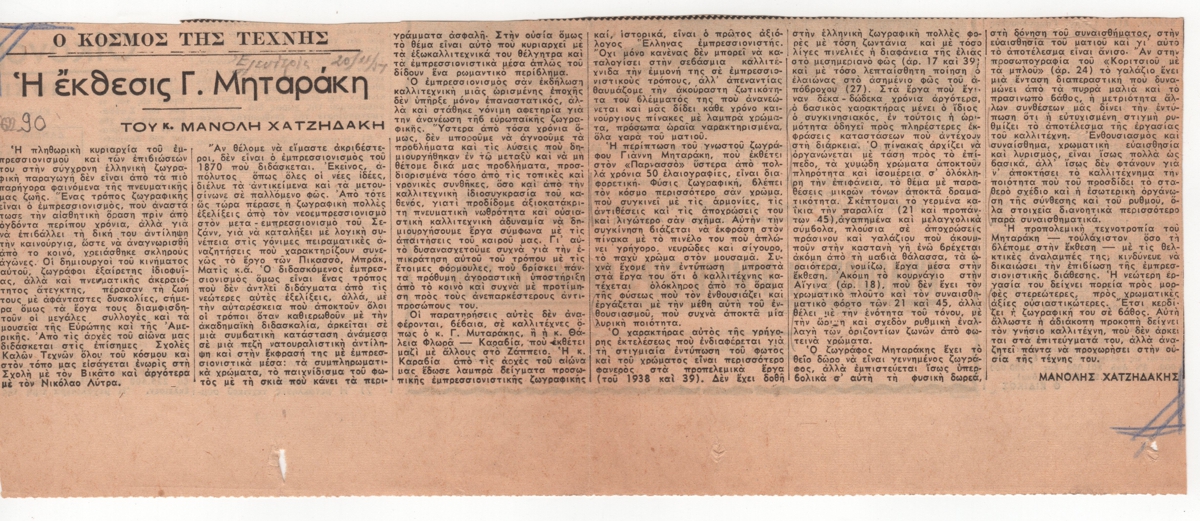 Απόκομμα, έντυπο, στα ελληνικά, χαρτί, 12,0×29,0 εκ., όπου δημοσιεύεται κριτική του Μανόλη Χατζηδάκη για την ατομική έκθεση ζωγραφικής του Γιάννη Μηταράκη στην Αθήνα το 1951. Πάνω από τον τίτλο επιγραφή με τα στοιχεία της δημοσίευσης.