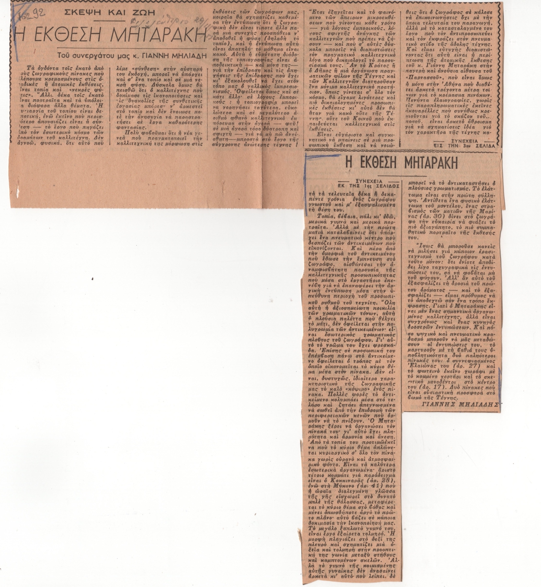 Απόκομμα, έντυπο, στα ελληνικά, χαρτί, 28,8×24,2 εκ. (δύο τεμάχια επικολλημένα). Κριτική του Γιάννη Μηλιάδη για την ατομική έκθεση ζωγραφικής του Γιάννη Μηταράκη στην Αθήνα το 1951. Το δημοσίευμα εντάσσεται στη στήλη “Σκέψη και ζωή”. Πάνω από τον τίλο επιγραφή με τα στοιχεία της δημοσίευσης.
