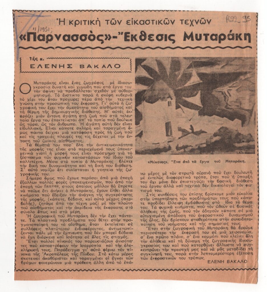 Απόκομμα, έντυπο, στα ελληνικά, χαρτί, 17,0×15,3 εκ., όπου δημοσιεύεται κριτική της Ελένης Βακαλό για την ατομική έκθεση ζωγραφικής του Γιάννη Μηταράκη στην Αθήνα. Εικονογραφείται με αναπαραγωγή έργου.