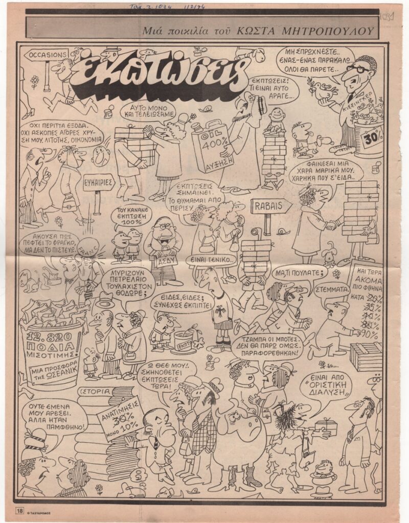 Απόκομμα, έντυπο, στα ελληνικά, χαρτί, 32,3×24,4 εκ. Σχολιασμός της επικαιρότητας με γελοιογραφίες του Κ. Μητρόπουλου. Εντάσσεται στη στήλη “Μία ποικιλία του Κώστα Μητρόπουλου”. Στην πίσω σελίδα άρθρο του Κώστα Ρεσβάνη με τίτλο “Το κυνήγι για τον καινούργιο τρόπο ζωής θ’αρχίση σύντομα”. Επάνω, επιγραφές με τα στοιχεία της δημοσίευσης.