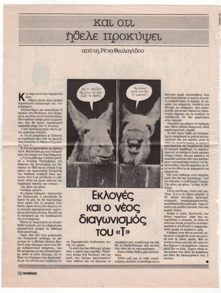 Απόκομμα, έντυπο, στα ελληνικά, ιλουστρασιόν χαρτί, 30,0×23,0 εκ. Σχολιασμός της επικαιρότητας με γελοιογραφίες του Κ. Μητρόπουλου. Στην άλλη όψη άρθρο της Ρένας Θεολογίδου με τίτλο “Εκλογές και ο νέος διαγωνισμός του “Τ” σχετικά με την προκύρηξη πρόωρων εκλογών. Εντάσσεται στη στήλη “Και ό,τι ήθελε προκύψει”.