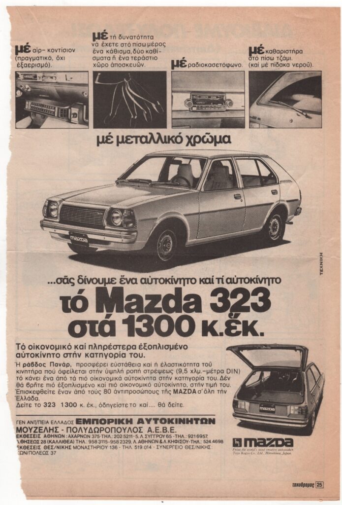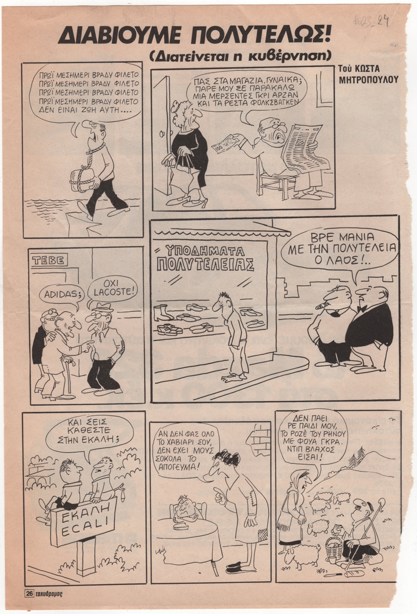 Απόκομμα, έντυπο, στα ελληνικά, χαρτί, 32,5×22,0 εκ. Σχολιασμός της επικαιρότητας με γελοιογραφίες του Κ. Μητρόπουλου. Στην άλλη όψη διαφήμιση της αυτοκινητοβιομηχανίας Mazda.