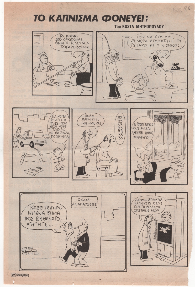 Απόκομμα, έντυπο, στα ελληνικά, χαρτί, 32,522,0 εκ. Σχολιασμός της επικαιρότητας με γελοιογραφίες του Κ. Μητρόπουλου. Στην άλλη όψη απόσπασμα άρθρου για το Κυπριακό.