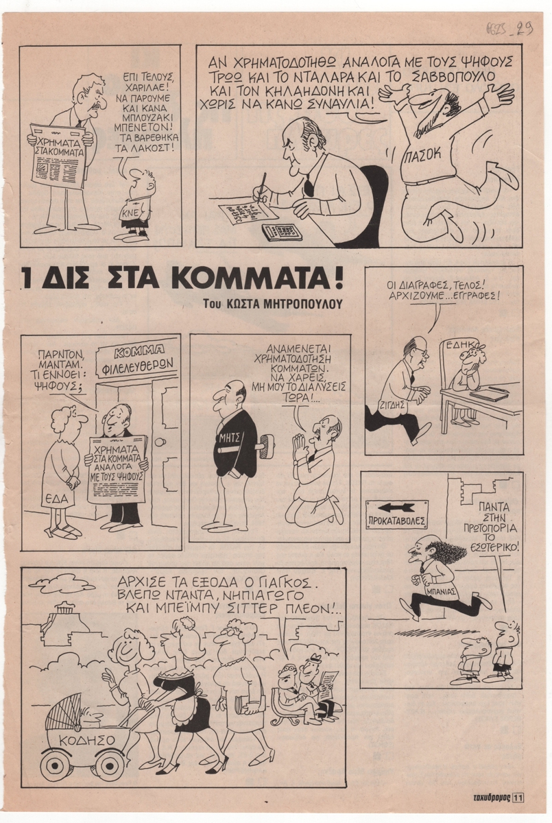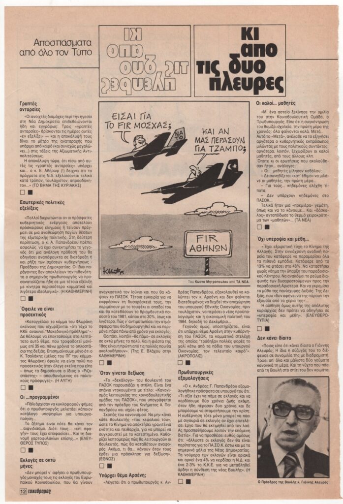 Απόκομμα, έντυπο, στα ελληνικά, χαρτί, 32,5×22,0 εκ. Σχολιασμός της επικαιρότητας με γελοιογραφίες του Κ. Μητρόπουλου. Στην άλλη όψη αποσπάσματα από όλο τον Τύπο στη στήλη “κι από τις δύο πλευρές”. Περιλαμβάνει αναδημοσίευση γελοιογραφίας του Κ. Μητρόπουλου στην εφημερίδα ΤΑ ΝΕΑ.