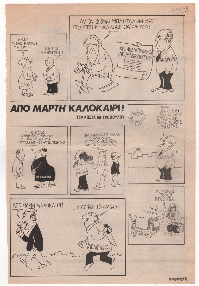 Σχολιασμός της επικαιρότητας με γελοιογραφίες του Κ. Μητρόπουλου. Στην άλλη όψη αποσπάσματα από όλο τον Τύπο στη στήλη “κι από τις δύο πλευρές”. Περιλαμβάνει αναδημοσίευση γελοιογραφίας του Κ. Μητρόπουλου στην εφημερίδα ΤΑ ΝΕΑ.