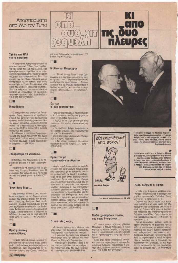 Σχολιασμός της επικαιρότητας με γελοιογραφίες του Κ. Μητρόπουλου. Στην άλλη όψη αποσπάσματα από όλο τον Τύπο στη στήλη “κι από τις δύο πλευρές”. Περιλαμβάνει αναδημοσίευση γελοιογραφίας του Κ. Μητρόπουλου στην εφημερίδα ΤΑ ΝΕΑ.