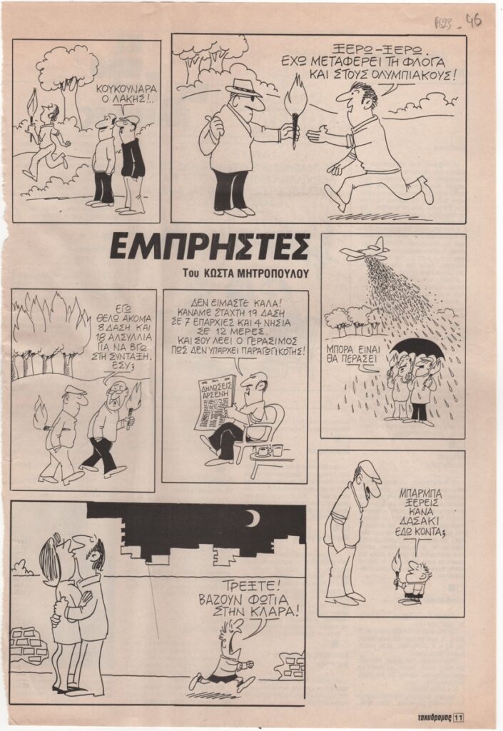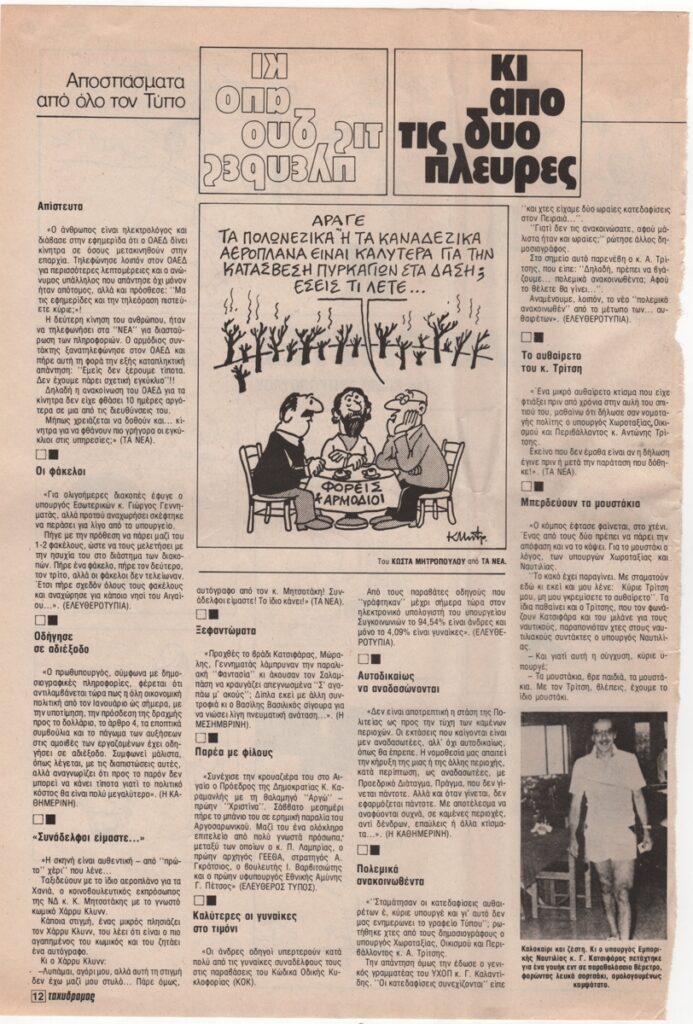 Απόκομμα, έντυπο, στα ελληνικά, χαρτί, 32,5×22,0 εκ. Σχολιασμός της επικαιρότητας με γελοιογραφίες του Κ. Μητρόπουλου. Στην άλλη όψη αποσπάσματα από όλο τον Τύπο στη στήλη “κι από τις δύο πλευρές”. Περιλαμβάνει αναδημοσίευση γελοιογραφίας του Κ. Μητρόπουλου στην εφημερίδα ΤΑ ΝΕΑ.