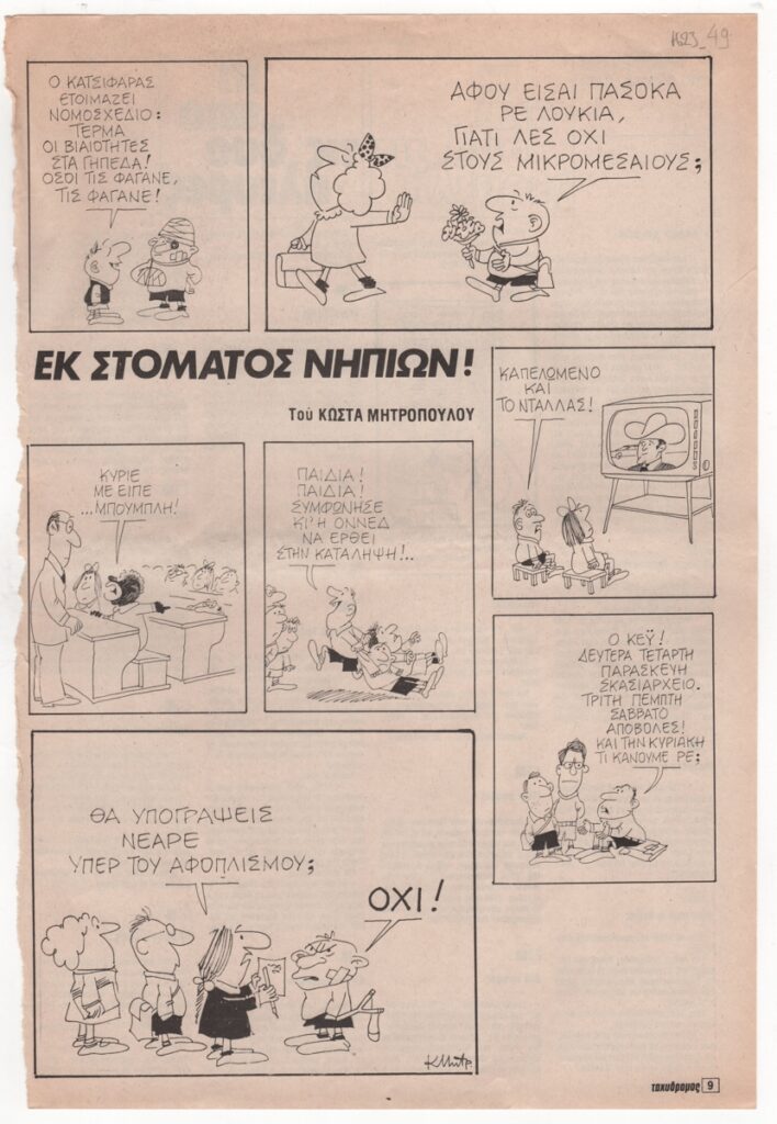 Απόκομμα, έντυπο, στα ελληνικά, χαρτί, 32,5×22,0 εκ. Σχολιασμός της επικαιρότητας με γελοιογραφίες του Κ. Μητρόπουλου. Στην άλλη όψη αποσπάσματα από όλο τον Τύπο στη στήλη “κι από τις δύο πλευρές”. Περιλαμβάνει γελοιογραφία του Κ. Μητρόπουλου.