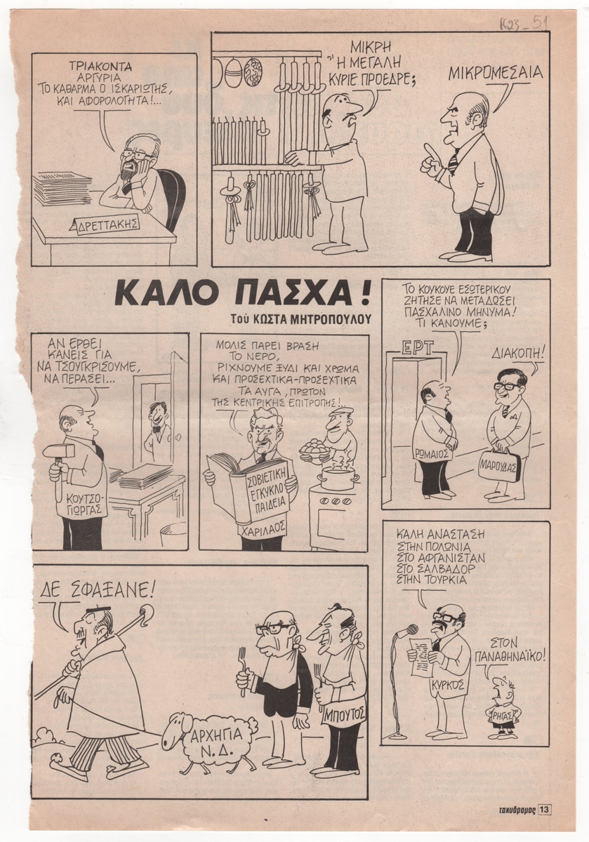 Απόκομμα, έντυπο, στα ελληνικά, χαρτί, 32,5×22,0 εκ.Σχολιασμός της επικαιρότητας με γελοιογραφίες του Κ. Μητρόπουλου. Στην άλλη όψη αποσπάσματα από όλο τον Τύπο στη στήλη “κι από τις δύο πλευρές”. Περιλαμβάνει γελοιογραφία του Κ. Μητρόπουλου.