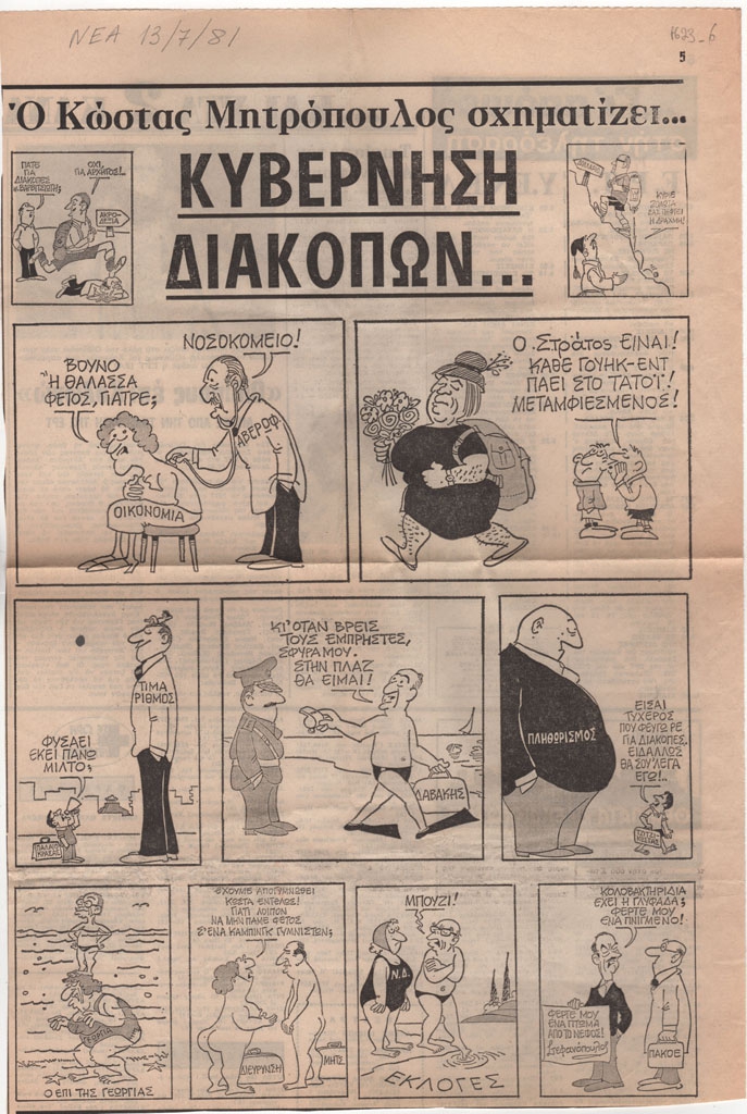 Απόκομμα, έντυπο, στα ελληνικά, χαρτί, 40,0×26,8 εκ.Σχολιασμός της επικαιρότητας με γελοιογραφίες του Κ. Μητρόπουλου. Στην πίσω όψη το πρόγραμμα της τηλεόρασης και παρουσίαση της τηλεοπτικής μετάδοση της παράστασης “Οιδίπους επί Κολωνώ” σε σκηνοθεσία Αλέξη Μινωτή. Επάνω, επιγραφή με τα στοιχεία της δημοσίευσης.