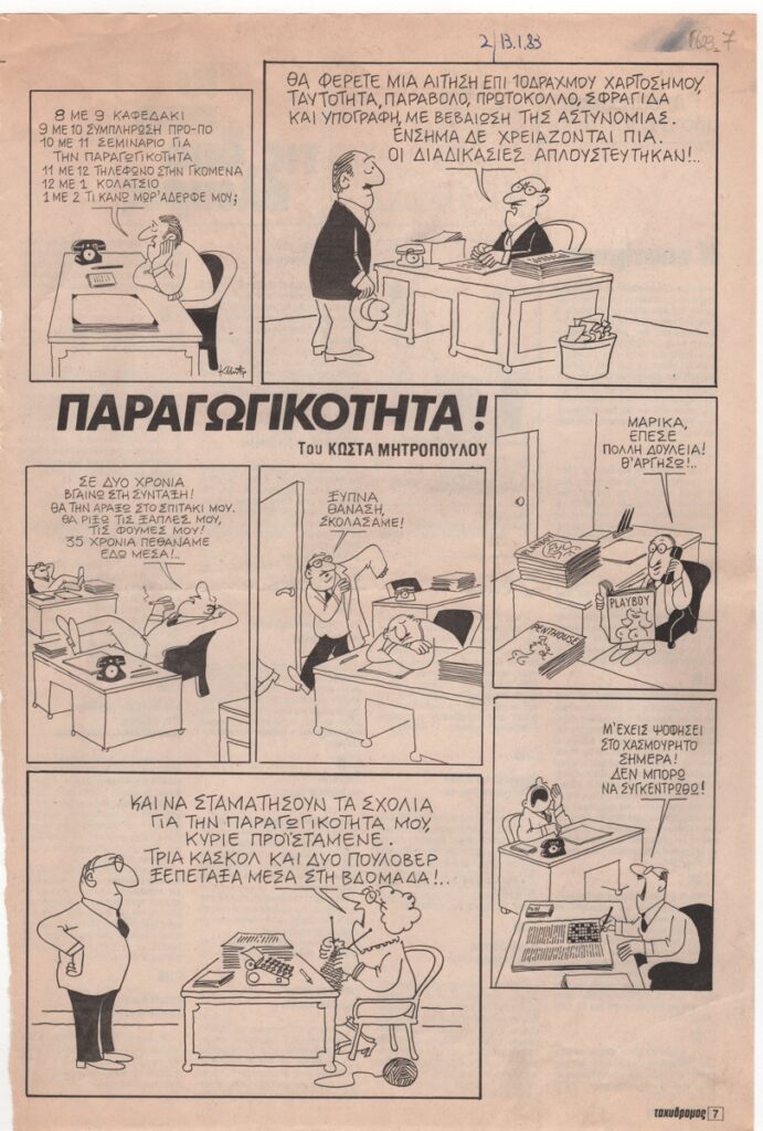 Απόκομμα, έντυπο, στα ελληνικά, χαρτί, 32,5×22,0 εκ. Σχολιασμός της επικαιρότητας με γελοιογραφίες του Κ. Μητρόπουλου. Στην άλλη όψη αποσπάσματα από όλο τον Τύπο στη στήλη “κι από τις δύο πλευρές”. Περιλαμβάνει αναδημοσίευση γελοιογραφίας του Κ. Μητρόπουλου στην εφημερίδα ΤΑ ΝΕΑ.
