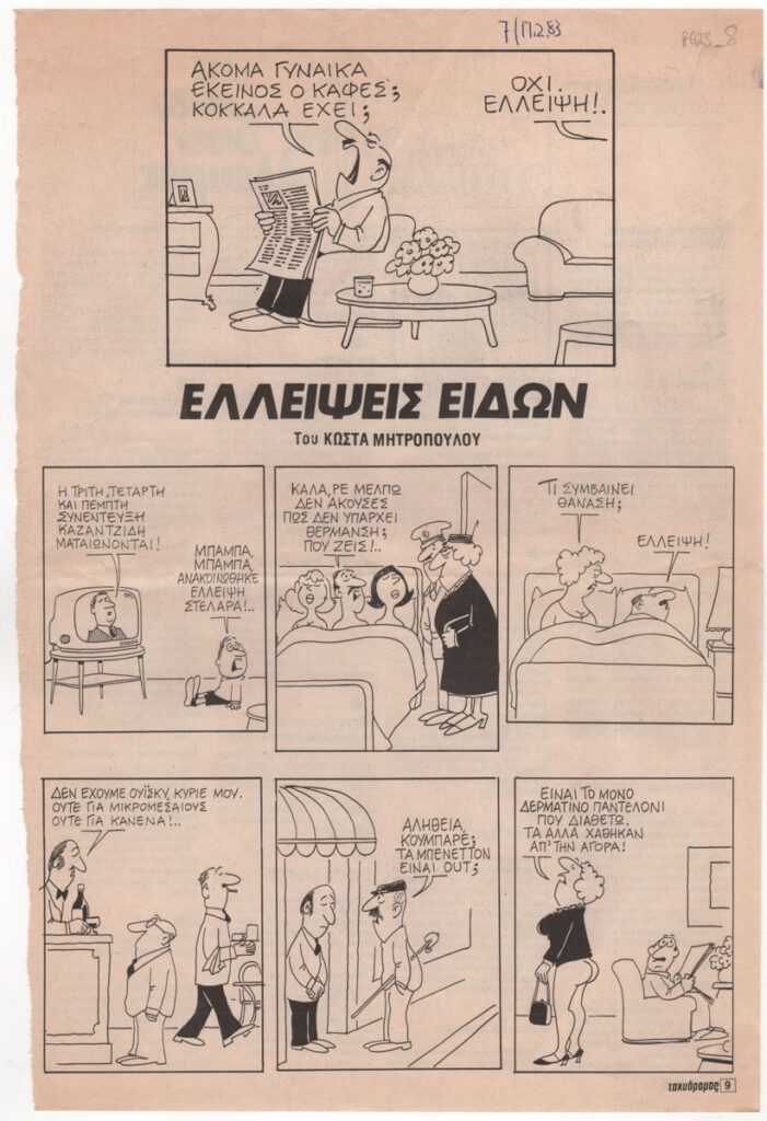 Απόκομμα, έντυπο, στα ελληνικά, χαρτί, 32,5×21,8 εκ. Σχολιασμός της επικαιρότητας με γελοιογραφίες του Κ. Μητρόπουλου. Στην άλλη όψη αποσπάσματα από όλο τον Τύπο στη στήλη “κι από τις δύο πλευρές”. Περιλαμβάνει αναδημοσίευση γελοιογραφίας του Κ. Μητρόπουλου στην εφημερίδα ΤΑ ΝΕΑ. Επιγραφές με τα στοιχεία της δημοσίευσης.