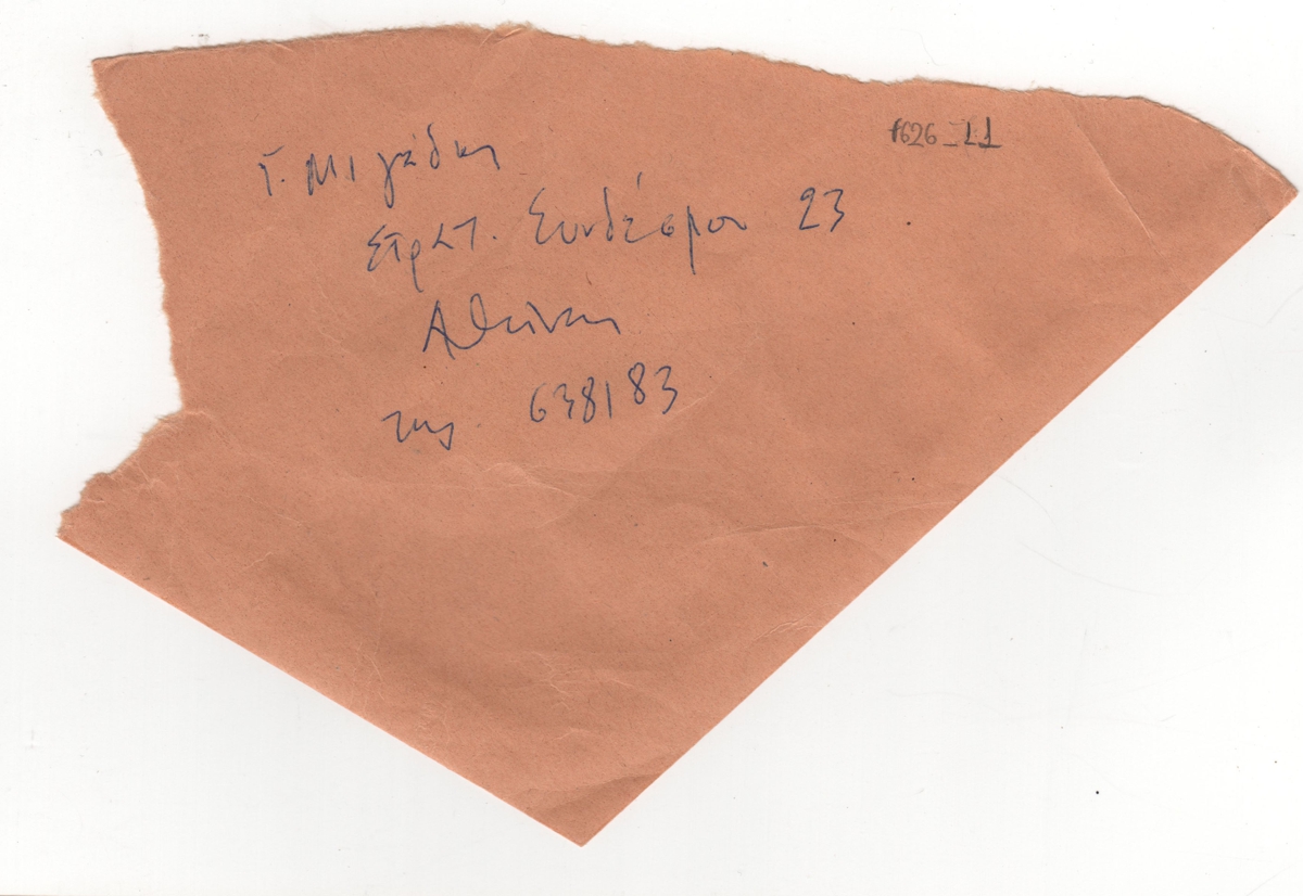 Απόκομμα ταχυδρομικού φακέλου με χειρόγραφη τη διεύθυνση του καλλιτέχνη.