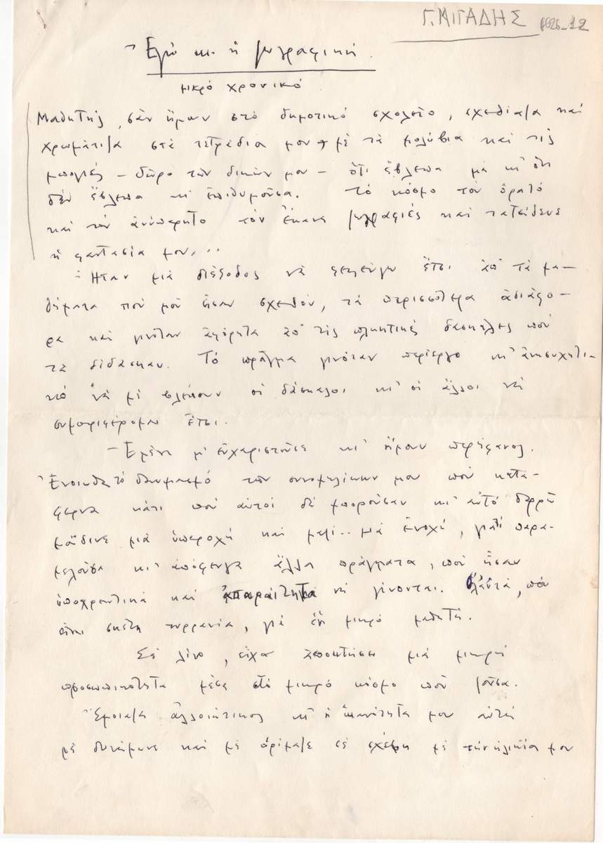 Κείμενο, χειρόγραφο, με μπλε μελάνι, στα ελληνικά, σε χαρτί, μία όψη, 29,7×20,8 εκ. Κείμενο του ζωγράφου Γιάννη Μιγάδη για το έργο του.