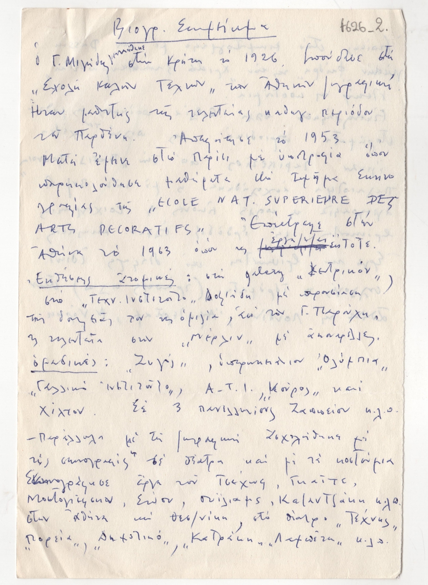 Κείμενο, στα ελληνικά, χειρόγραφο, με μπλε μελάνι, σε χαρτί, 21,2×14,3 εκ., δύο όψεις.