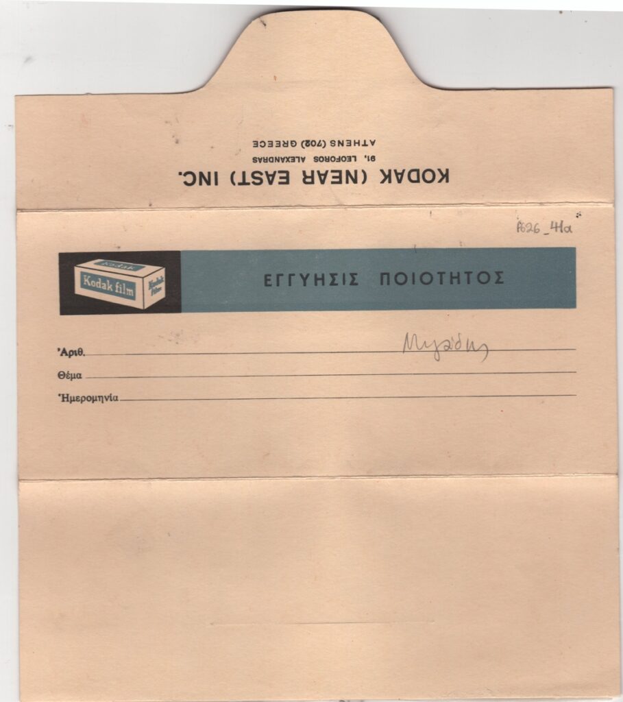 Φάκελος της εταιρίας Kodak στην Αθήνα που περιείχε τις διαφάνειες με αρ. GR TITSpit f626_41 έως GR TITSpit f626_46. Στην επιφάνεια του φακέλου επιγραφή.