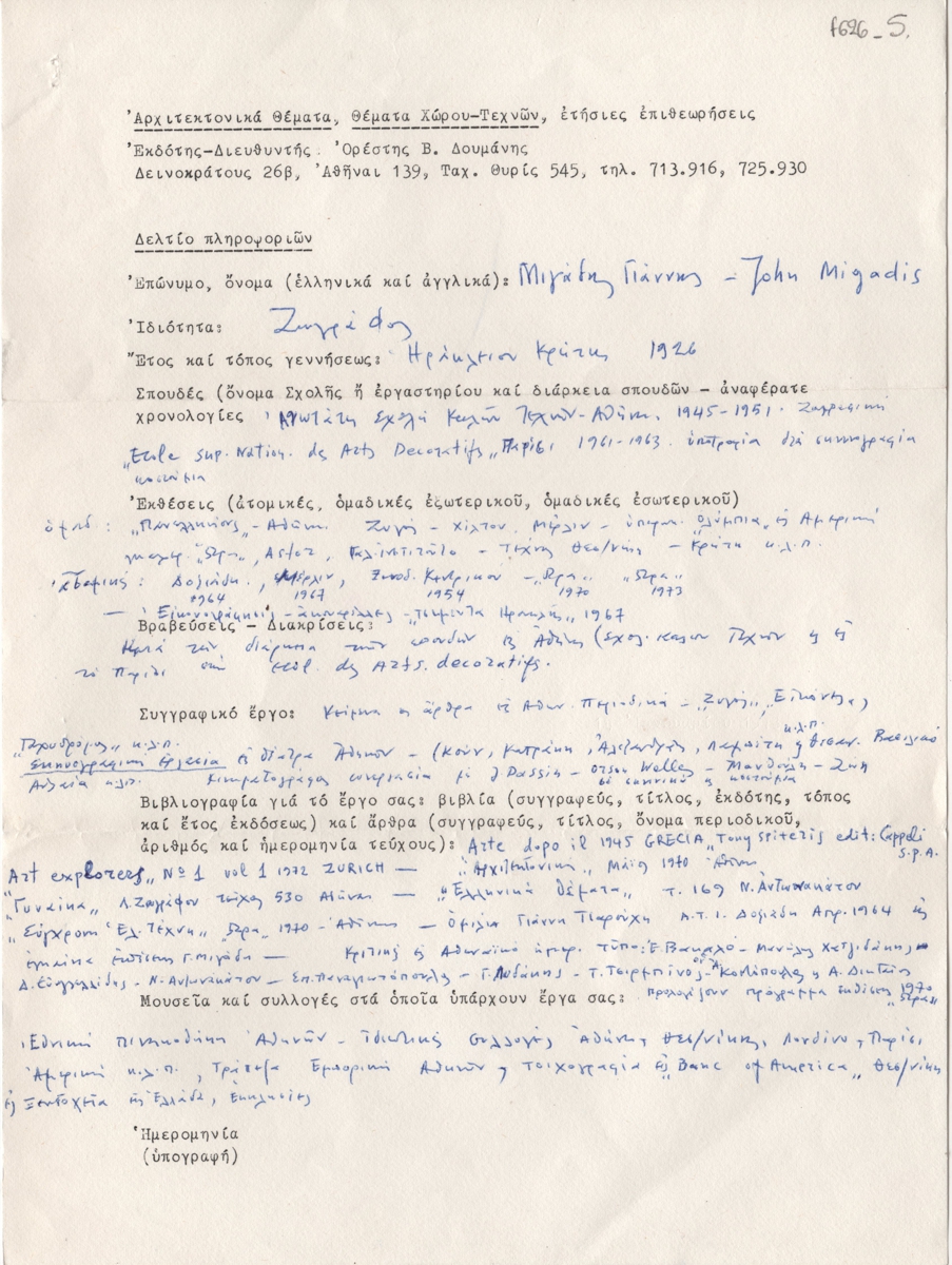 Φόρμα βιογραφικού των ετησίων επιθεωρήσεων “Αρχιτεκτονικά Θέματα” και “Θέματα Χώρου και Τεχνών” συμπληρωμένη από τον Γιάννη Μιγάδη. Αναφέρονται βασικά προσωπικά στοιχεία, σπουδές, εκθέσεις, βραβεύσεις-διακρίσεις, συγγραφικό έργο, βιβλιογραφία, φορείς στους οποίους ανήκουν έργα του.