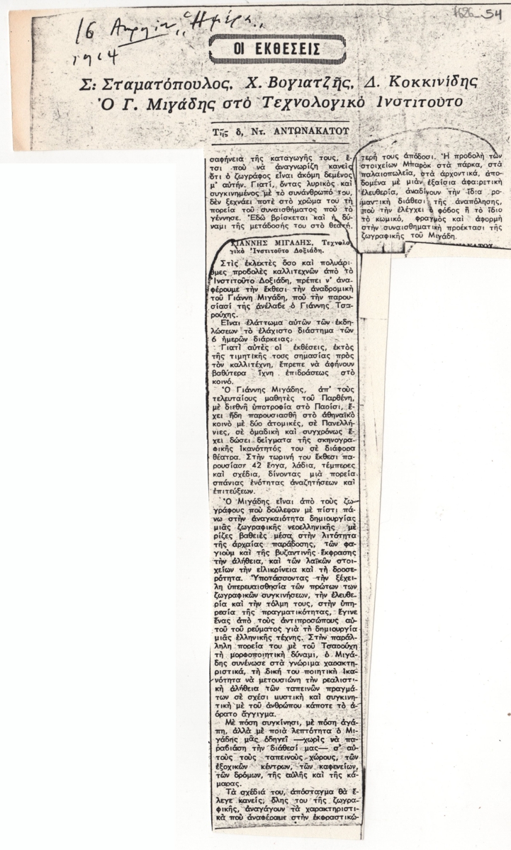 Φωτοαντίγραφο αποκόμματος της εφημερίδας Ημέρα, με απόσπασμα κριτικής της Ντιάνας Αντωνακάτου για την ατομική έκθεση ζωγραφικής του Γιάννη Μιγάδη στο Τεχνολογικό Ινστιτούτο Δοξιάδη στην Αθήνα το 1964. Τα αποσπάσματα που αφορούν στις κριτικές των εκθέσεων των Σ. Σταματόπουλου, Χ. Βογιατζή και Δ. Κοκκινίδη έχουν αποκοπεί. Επάνω, επιγραφή με τα στοιχεία της δημοσίευσης.