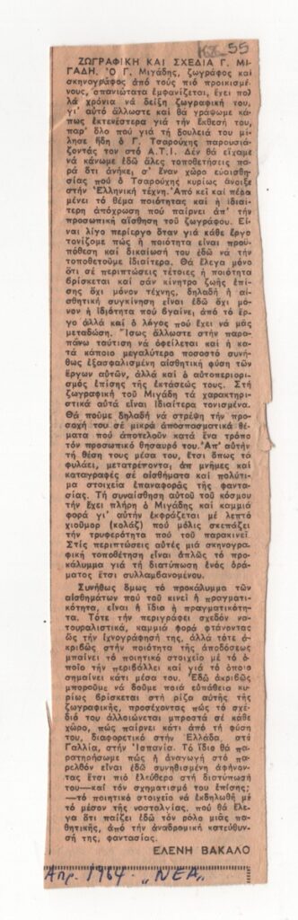 Απόκομμα, έντυπο, χαρτί, 20×5,2 εκ., όπου δημοσιεύεται, στα ελληνικά, κριτική της Ελένης Βακαλό για την ατομική έκθεση ζωγραφικής του Γιάννη Μιγάδη στην Αθήνα το 1964. Κάτω, επιγραφή με τα στοιχεία της δημοσίευσης.