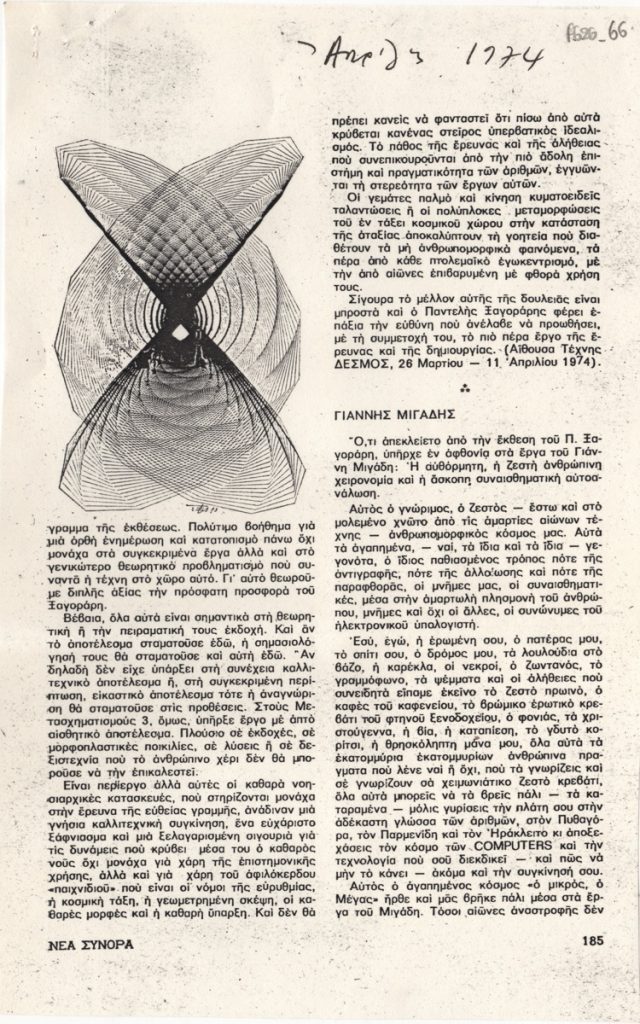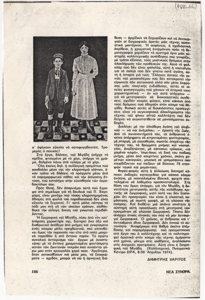 Φωτοαντίγραφο αποκόμματος, έντυπο, χαρτί, 2 φφ., 24,2×26,4 εκ., όπου δημοσιεύεται κριτική του Δημήτρη Χαρίτου για την ατομική έκθεση ζωγραφικής του Γιάννη Μιγάδη στην Αθήνα το 1974. Στο δεύτερο φύλλο εικονογράφηση. Στο ίδιο απόκομμα, απόσπασμα κριτικής της ατομικής έκθεσης ζωγραφικής του Παντελή Ξαγοράρη στην Αθήνα την ίδια περίοδο. Στο πρώτο φύλλο, επιγραφή με τα στοιχεία δημοσίευσης.