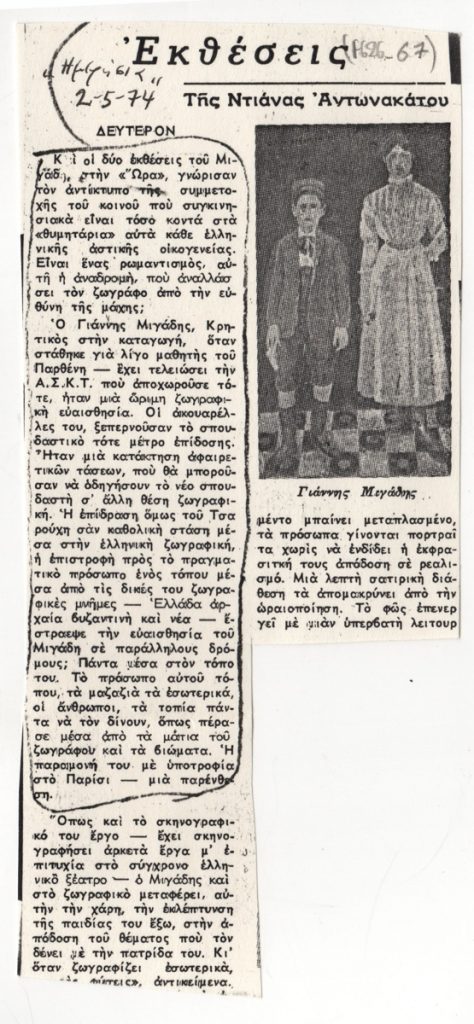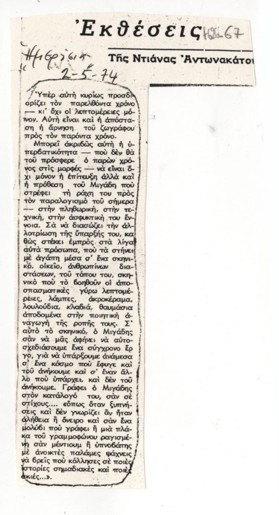 Φωτοαντίγραφα αποκομμάτων, χαρτί, 2 φφ, 18,2×9,5 και 21,0×9,5 εκ., όπου δημοσιεύεται κριτκή της Ντιάνας Αντωνακάτου για την ατομική έκθεση ζωγραφικής του Γιάννη Μιγάδη στην Αθήνα το 1974. Εικονογραφείται με αναπαραγωγή έργου. Στην επιφάνεια του αποκόμματος επιγραφές.