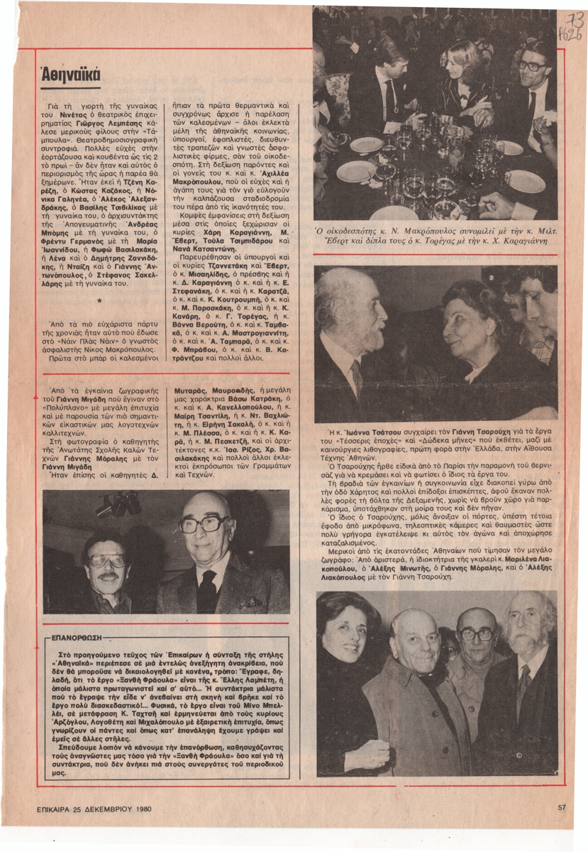 Απόκομμα, έντυπο, χαρτί, 29,2×20,6 εκ., όπου δημοσιεύεται φωτορεπορτάζ, στα ελληνικά, από την κοσμική και πολιτιστική κίνηση της περιόδου. Αφορά τα πάρτυ του θεατρικού επιχειρηματία Γιώργου Λεμπέση και του ασφαλιστή Νίκου Μακρόπουλου, τα εγκαίνια της έκθεσης ζωγραφικής του Γιάννη Μιγάδη στην Αίθουσα Τέχνης ΠΟΛΥΠΛΑΝΟ, και τα εγκαίνια έκθεσης λιθογραφιών του Γιάννη Τσαρούχη (εικονογραφείται με φωτογραφίες από την εκδήλωση).