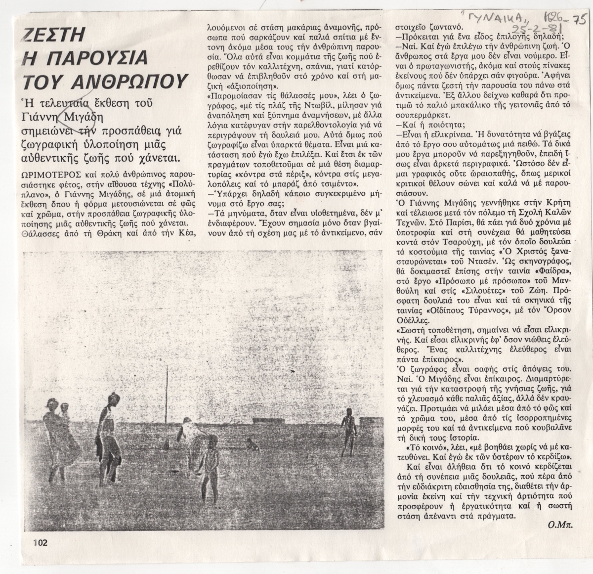 Φωτοαντίγραφο αποκόμματος, έντυπο, χαρτί, 20,2×21,0 εκ., όπου δημοσιεύεται, στα ελληνικά, κριτική της Όλγας Μπατή (Ο. Μπ.) για την ατομική έκθεση ζωγραφικής του Γιάννη Μιγάδη στην Αθήνα το 1980. Περιέχει αποσπάσματα συνέντευξης. Πάνω δεξιά, επιγραφή με τα στοιχεία της δημοσίευσης.