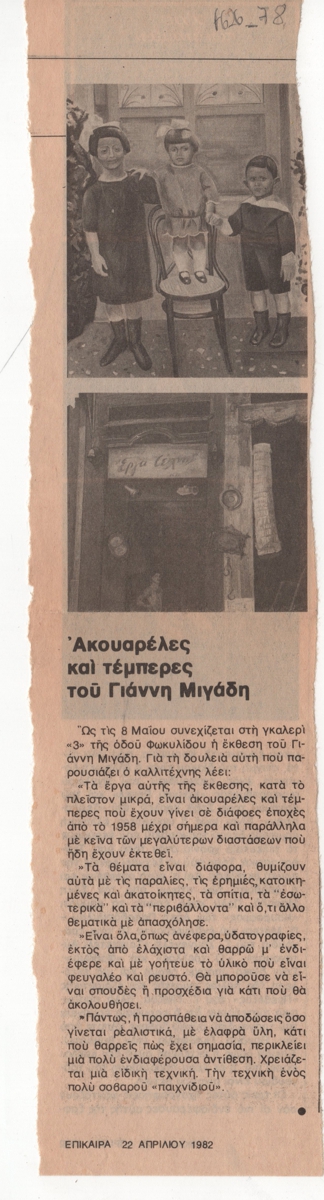 Απόκομμα, έντυπο, χαρτί, 29,3×7,3 εκ., όπου δημοσιεύεται, στα ελληνικά, απόσπασμα συνέντευξης του ζωγράφου Γιάννη Μιγάδη όπου σχολιάζει την ατομική έκθεση έργων του στην Αθήνα το 1982. Στην άλλη όψη απόσπασμα παρουσίασης δίσκων βινυλίου των: Σταμάτη Σπανουδάκη, Κώστα Χατζή και Άκη Πάνου.