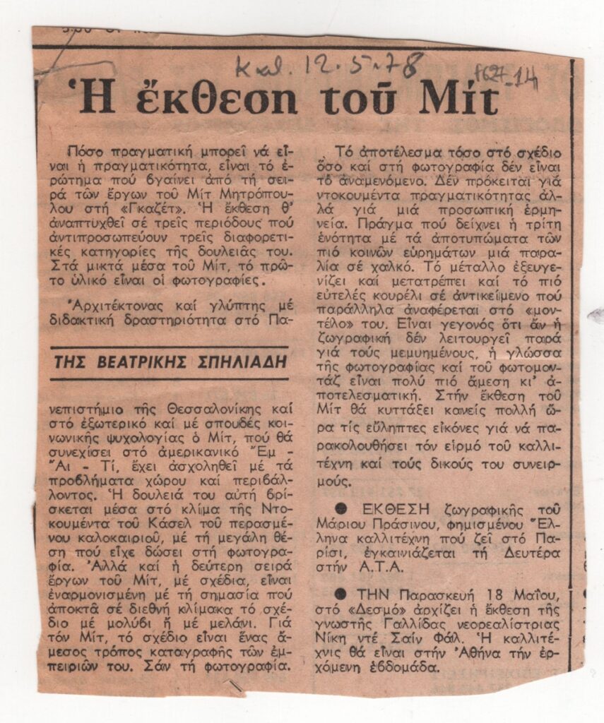 Απόκομμα, έντυπο, χαρτί, 12,5×10,2 εκ., όπου δημοσιεύεται, στα ελληνικά, κριτική της Βεατρίκης Σπηλιάδη για την έκθεση του Ευθυμίου Μητρόπουλου (ΜΙΤ) στο βιβλιοπωλείο Γκαζέτ στην Αθήνα το 1978. Στο ίδιο δημοσίευμα γίνεται αναφορά στην ατομική έκθεση ζωγραφικής του Μάριου Πράσινου. και την ατομική έκθεση της γαλλίδα νεορεαλίστριας Νίκη ντε Σαιν Φαλ στην Αθήνα την ίδια περίοδο. Επάνω, επιγραφή με τα στοιχεία της δημοσίευσης.