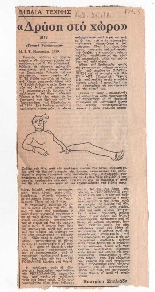 Απόκομμα, έντυπο, χαρτί, 25,0×11,7 εκ., όπου δημοσιεύεται άρθρο της Βεατρίκης Σπηλιάδη σχετικά με την παρουσίαση του βιβλίου του αρχιτέκτονα και γλύπτη Ευθύμιου Μητρόπουλου (ΜΙΤ) “Για τη δράση στο χώρο” (Toward Performance). Εικονογραφείται με αναπαραγωγή έργου. Επάνω, επιγραφή με τα στοιχεία της δημοσίευσης.