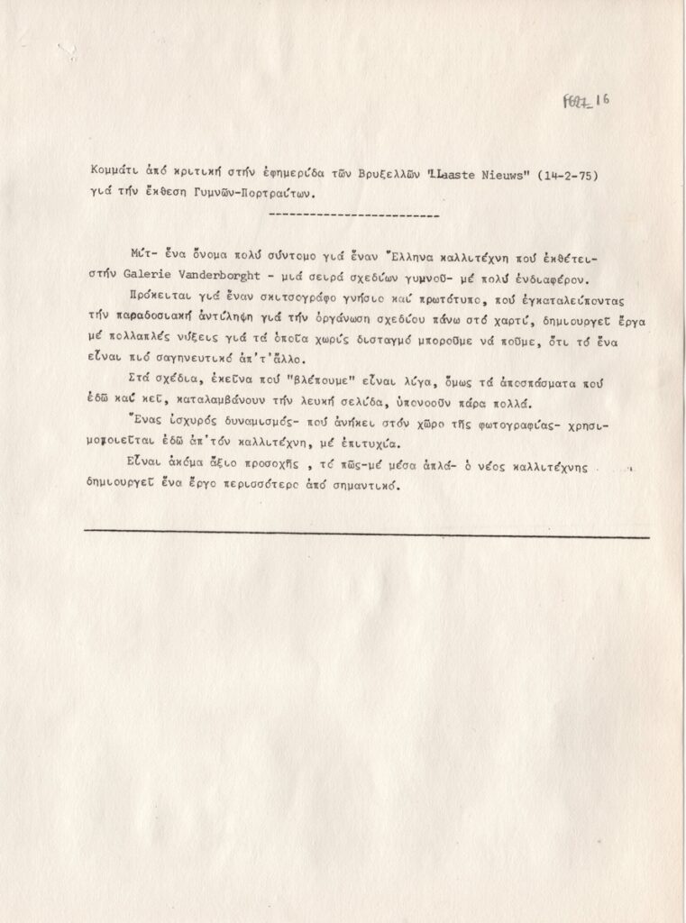 Κείμενο, δακτυλόγραφο, χαρτί, 28,8×21,4 εκ. Αποδελτίωση, στα ελληνικά, κριτικής που δημοσιεύτηκε στην εφημερίδα LAASTE NΙEUWS των Βρυξελλών για την έκθεση Γυμνών-Πορτραίτων του Ευθύμιου Μητρόπουλου (ΜΙΤ).