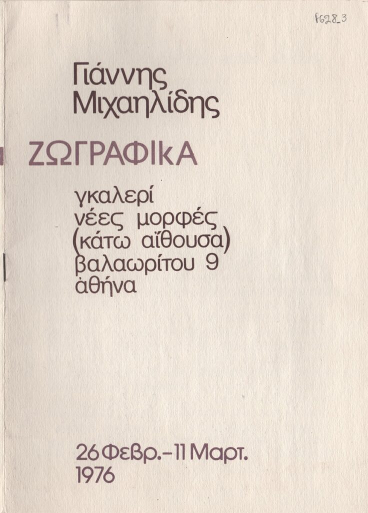 Έντυπο, στα ελληνικά, πολυσέλιδο, χαρτόνι, 23,2×16,7 εκ. Κατάλογος της ατομικής έκθεσης ζωγραφικής του Γιάννη Μιχαηλίδη με τίτλο “30 Μικρά Ζωγραφικά” στην Αθήνα το 1976. Περιέχει κείμενο του Γιάννη Κοντού και σύντομο βιογραφικό καλλιτέχνη. Εικονογραφείται με αναπαραγωγές έργων.