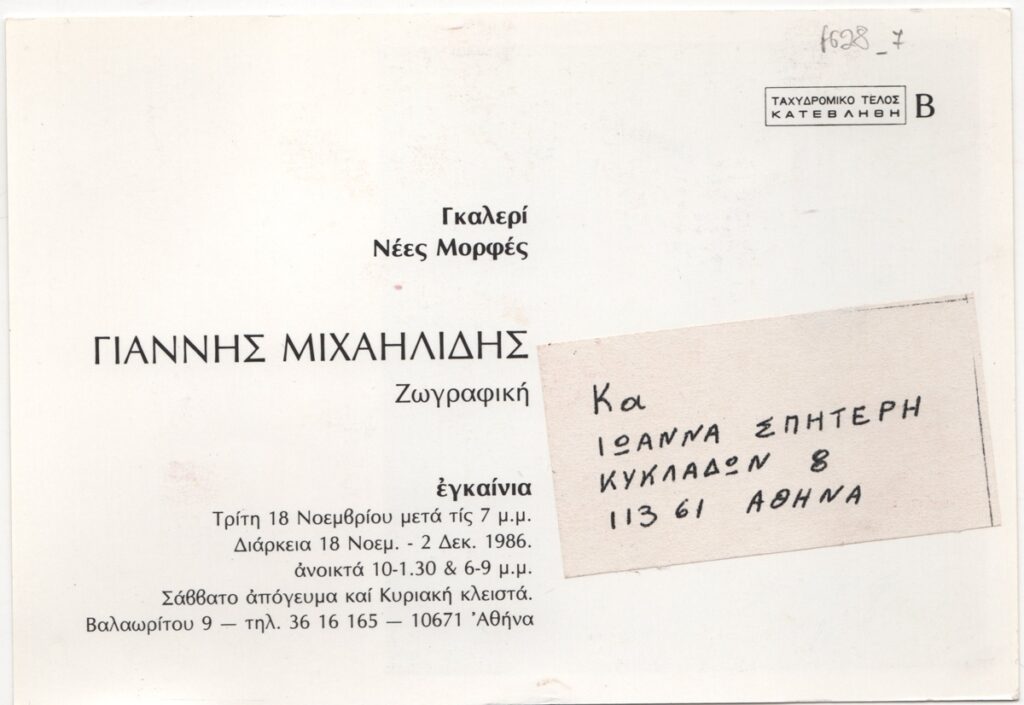 Έντυπο, στα ελληνικά, μονόφυλλο, χαρτόνι, δύο όψεις, 11,0×16,0 εκ. Πρόσκληση της ατομικής έκθεσης έργων του ζωγράφου Γιάννη Μιχαηλίδη στην Αθήνα το 1986. Στην μία όψη, εικονογράφηση. Στην άλλη όψη επικολλημένη αυτοκόλλητη ετικέτα με τα στοιχεία της Ιωάννας Σπητέρη ως παραλήπτη.