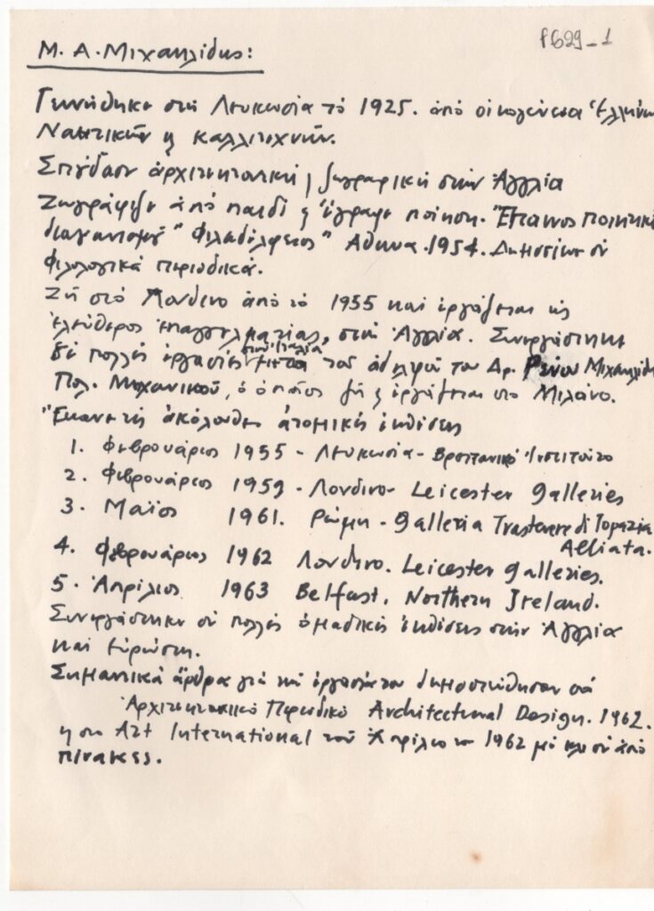Κείμενο, χειρόγραφο, με μαύρο μαρκαδόρο, στα ελληνικά, χαρτί, 19,5×14,5 εκ. Βιογραφικό σημείωμα του ζωγράφου Μιχάλη Μιχαηλίδη. Αναφέρονται σπουδές, ατομικές εκθέσεις έως το 1963 και βιβλιογραφία.