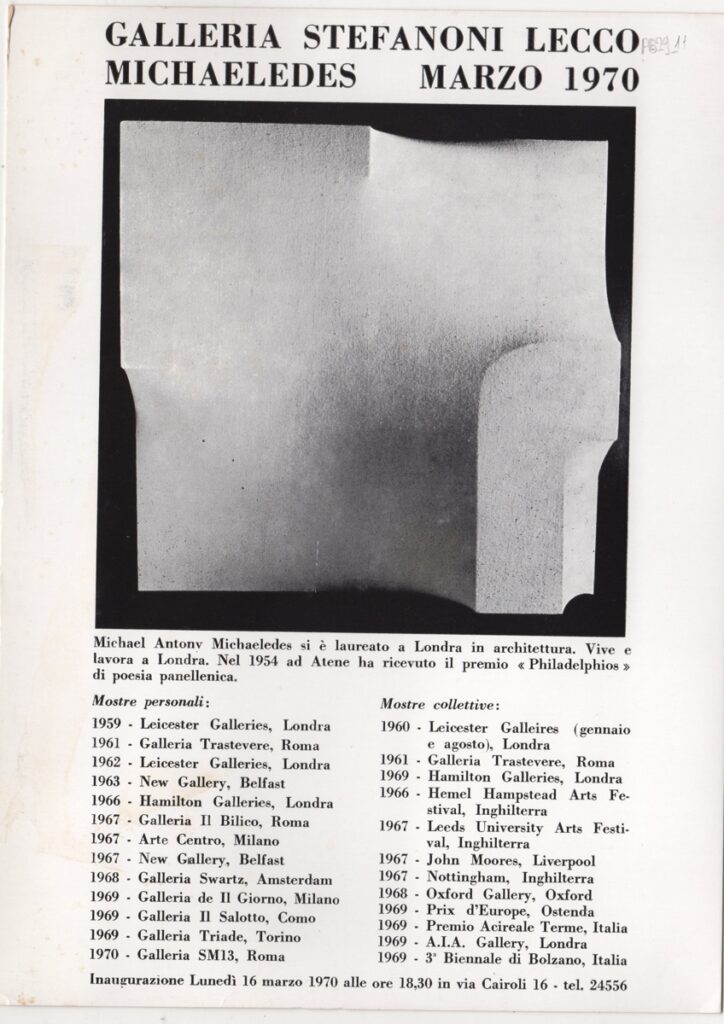 Έντυπο, στα ιταλικά, μονόφυλλο, χαρτόνι, μία όψη, 23,6×17,0 εκ. Έντυπο της ατομικής έκθεσης του Μιχάλη Μιχαηλίδη στη Galleria Stefanoni στο Lecco το 1970. Περιέχει σύντομο βιογραφικό καλλιτέχνη. Εικονογραφείται με αναπαραγωγή έργου, α/μ.