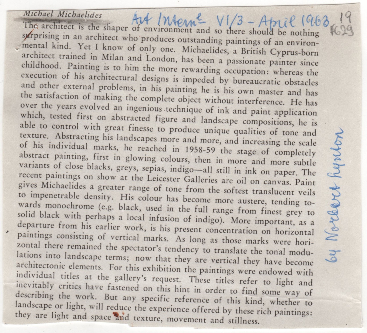 Αποκόμματα χαρτιού, 2 τμήματα, 9,2×10,3 και 10,0×19,8 εκ. Φωτοαντίγραφο αποκόμματος περιοδικού, όπου δημοσιεύεται, στα αγγλικά, άρθρο του Norbert Lynton για τον Μιχάλη Μιχαηλίδη. Εικονογράφηση. Στο πρώτο απόκομμα, επιγραφή με τα στοιχεία της δημοσίευσης.