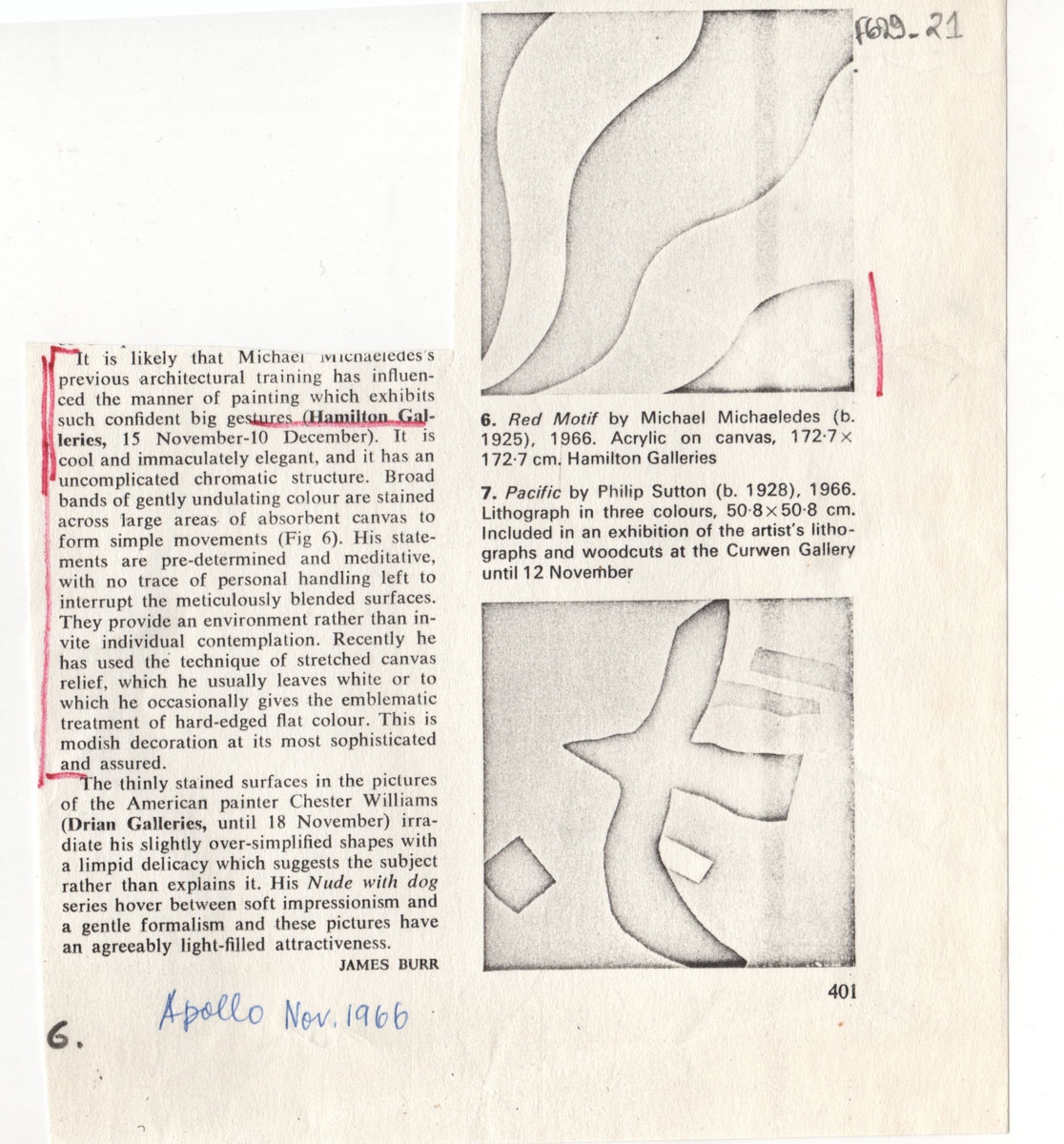 Απόκομμα χαρτιού, 18,2×15,5 εκ., ακανόνιστο σχήμα. Φωτοαντίγραφο αποκόμματος περιοδικού, όπου δημοσιεύεται, στα αγγλικά, κριτική του James Burr για την ατομική έκθεση του Μιχάλη Μιχαηλίδη στο Λονδίνο το 1966. Εικονογραφείται με αναπαραγωγές έργων του Μ. Μιχαηλίδη και του Ph. Sutton. Κάτω, επιγραφή με τα στοιχεία της δημοσίευσης.