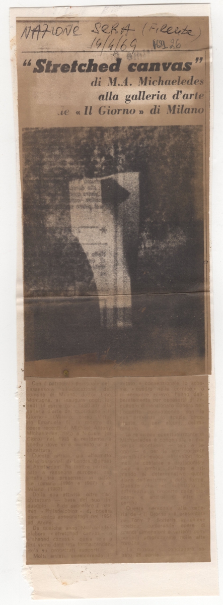 Απόκομμα χαρτιού, 25,8×8,7 εκ, επικολλημένο σε απόκομμα χαρτιού, 28,2×9,3 εκ. Φωτοαντίγραφο αποκόμματος εφημερίδας, όπου δημοσιεύεται, στα ιταλικά, κριτική για την έκθεση έργων του Μιχάλη Μιχαηλίδη στο Μιλάνο το 1969. Εικονογραφείται με αναπαραγωγή έργου. Επάνω, επιγραφή με τα στοιχεία της δημοσίευσης. Δυσανάγνωστο λόγω φθοράς.