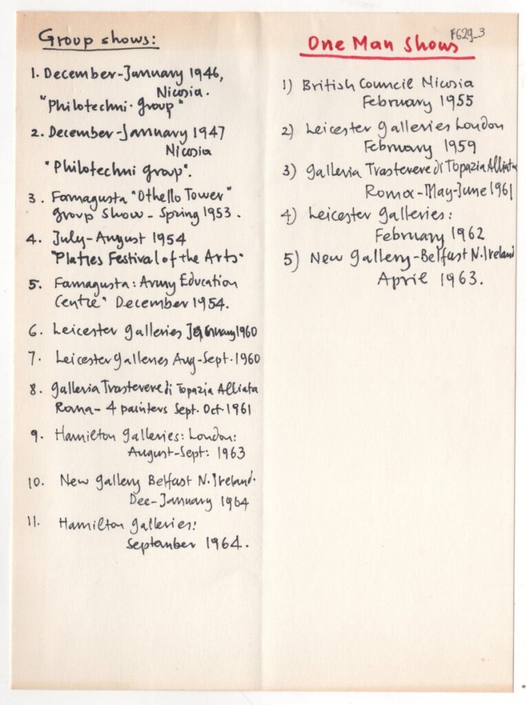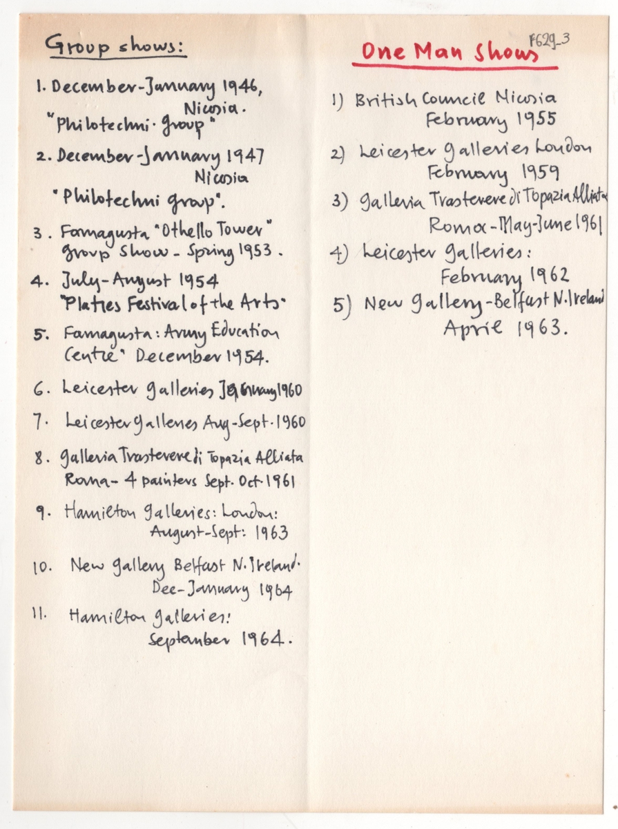 Κείμενο, στα ελληνικά, χειρόγραφο, με μαύρο και κόκκινο μαρκαδόρο, χαρτί, 3 φφ, μία όψης, 19,3×14,3 εκ. Κατάλογος ατομικών και ομαδικών εκθέσεων και βιβλιογραφικών πηγών για τον ζωγράφο Μιχάλη Μιχαηλίδη. Συνταγμένο από τον καλλιτέχνη (;).