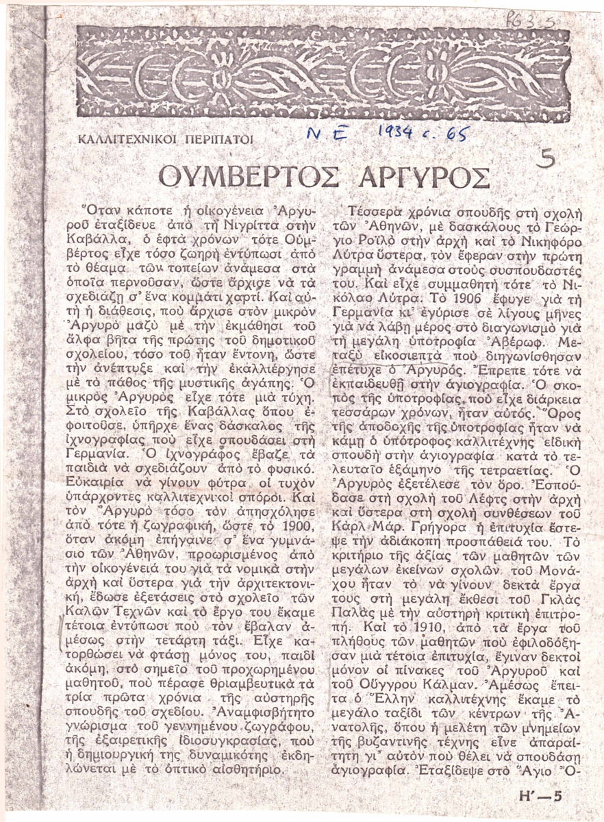 Φωτοαντίγραφο, χαρτί, 4 φφ, 21,5×16 και 13×16 εκ., στα ελληνικά, δημοσίευσης κειμένου για τον Ουμβέρτο Αργυρό. Εντάσσεται στη στήλη “Καλλιτεχνικοί περίπατοι” του περιοδικού, εικονογραφείται και φέρει επιγραφές.