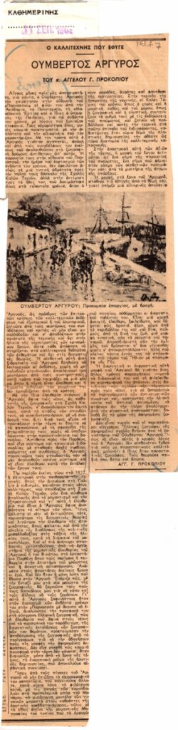 Απόκομμα, χαρτί, 10×8 εκ., στα ελληνικά, δημοσίευσης άρθρου για τον Ουμβέρτο Αργυρό με αφορμή το θάνατό του.